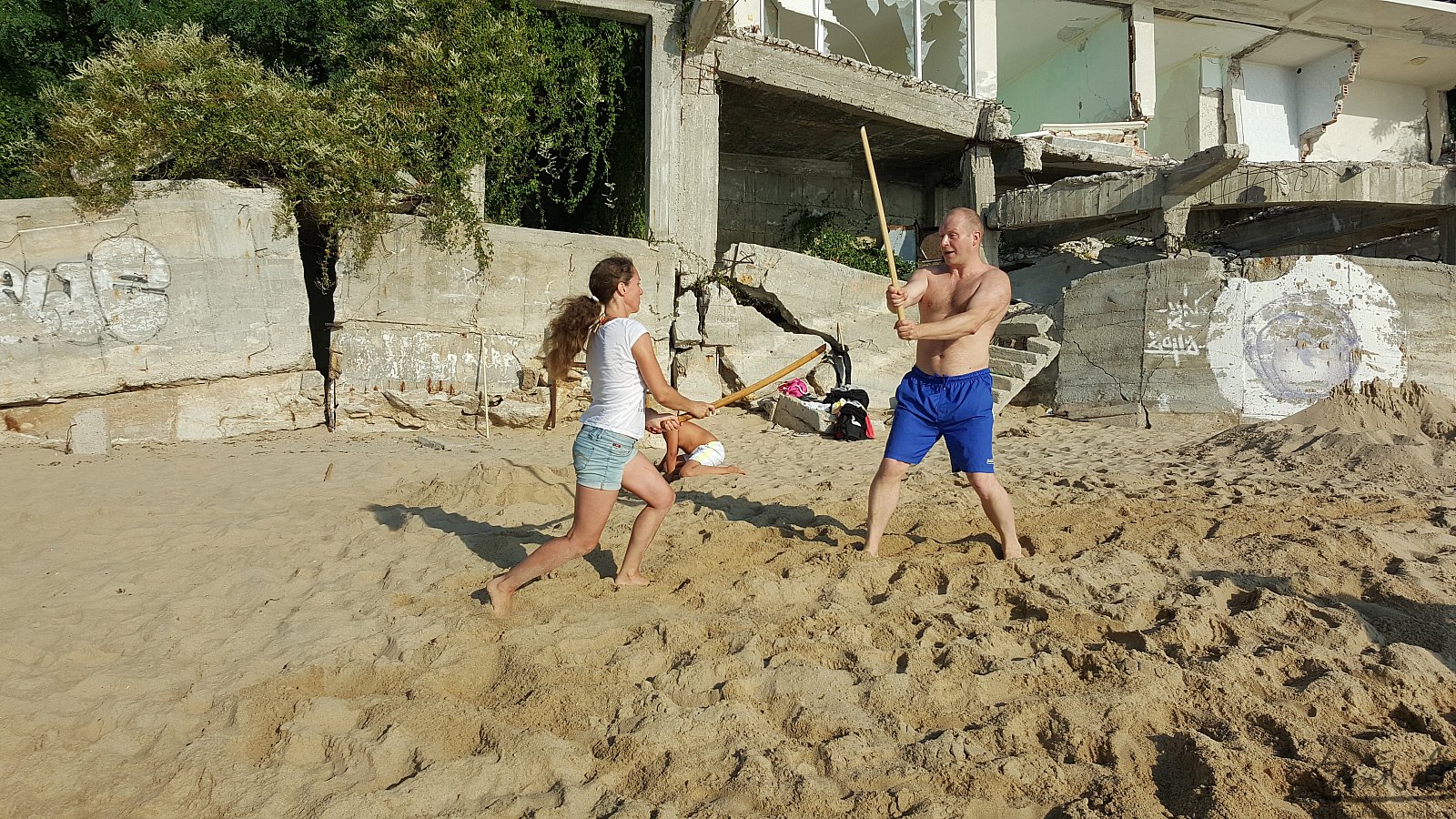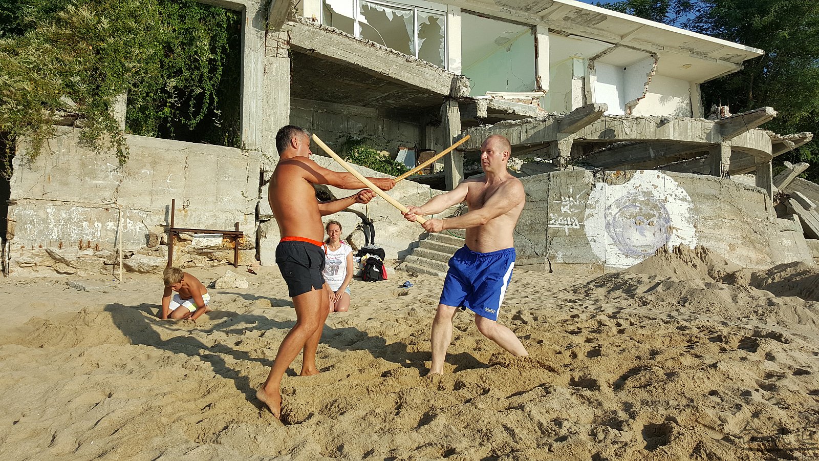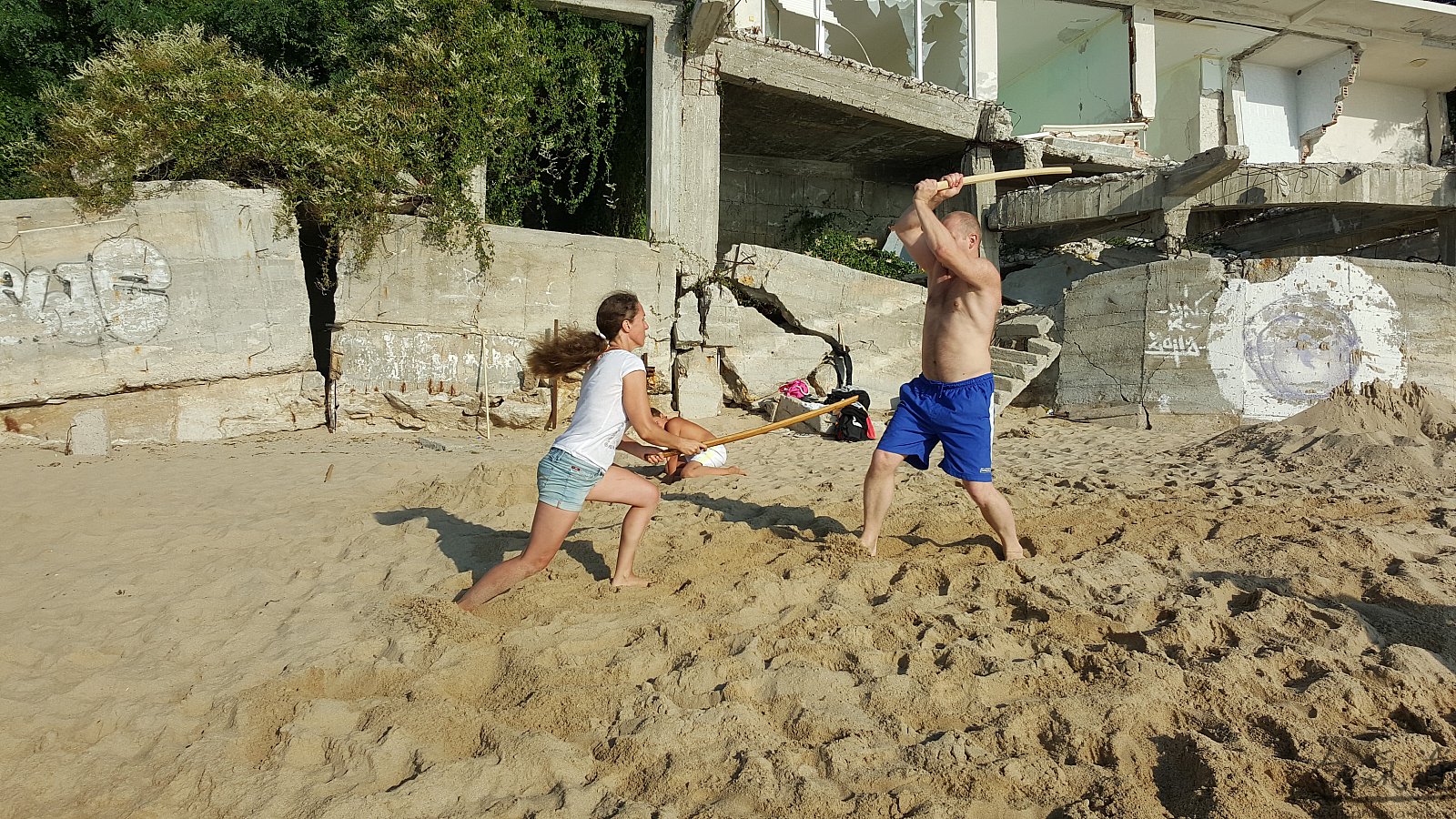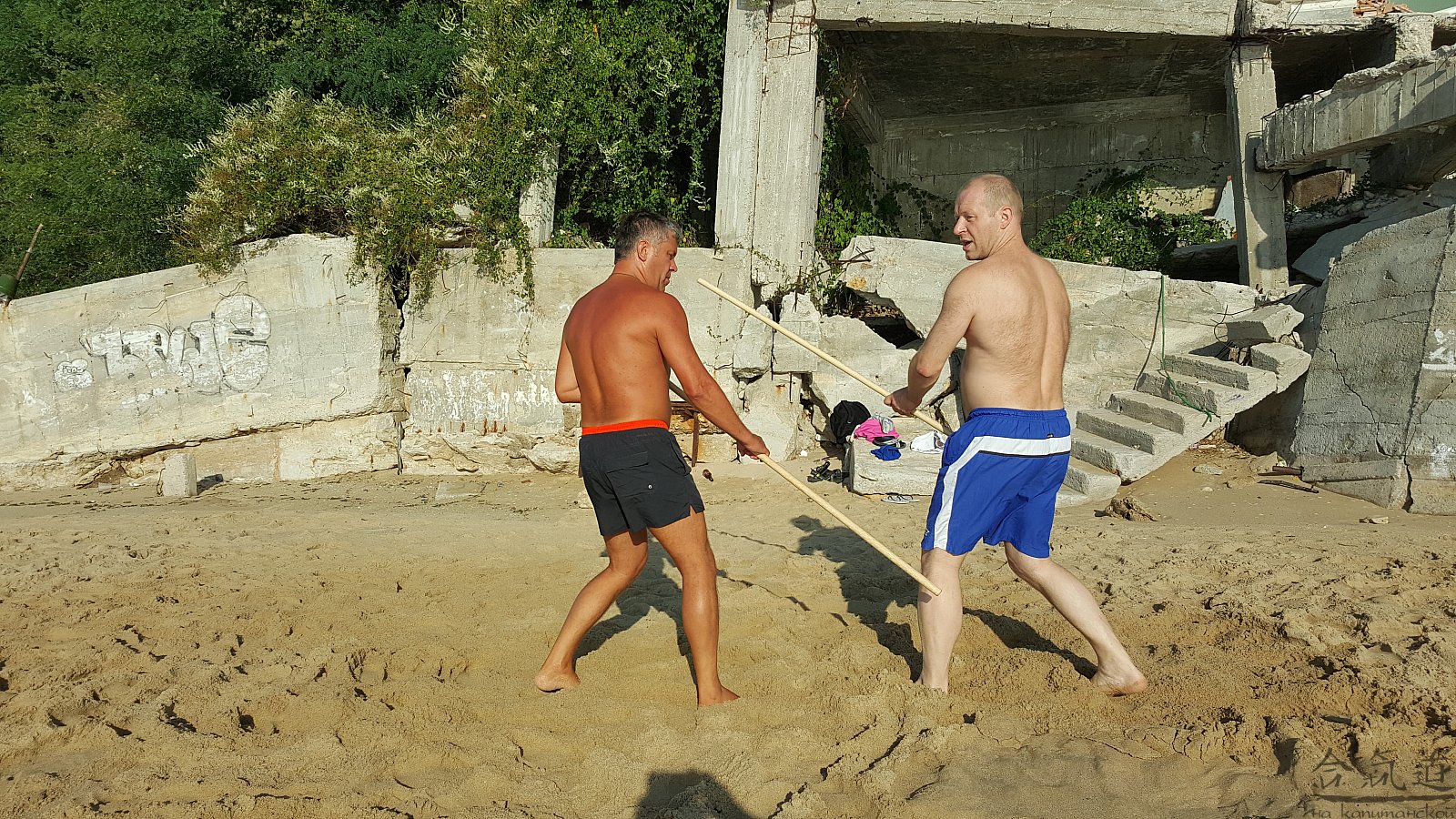 Практика кен-ва-джо на черноморском побережье. Ранним утром, пока солнце только-только начинает нагревать воздух, песчаные пляжи Варны - это, как говорят в Болгарии, истински райски кът для тренировок. А после практики можно охладиться, окунувшись в морские волны.