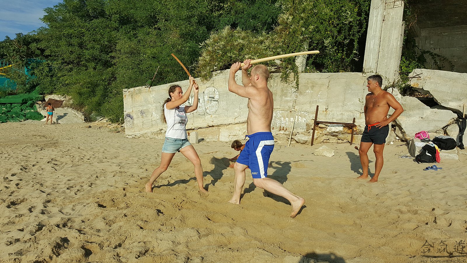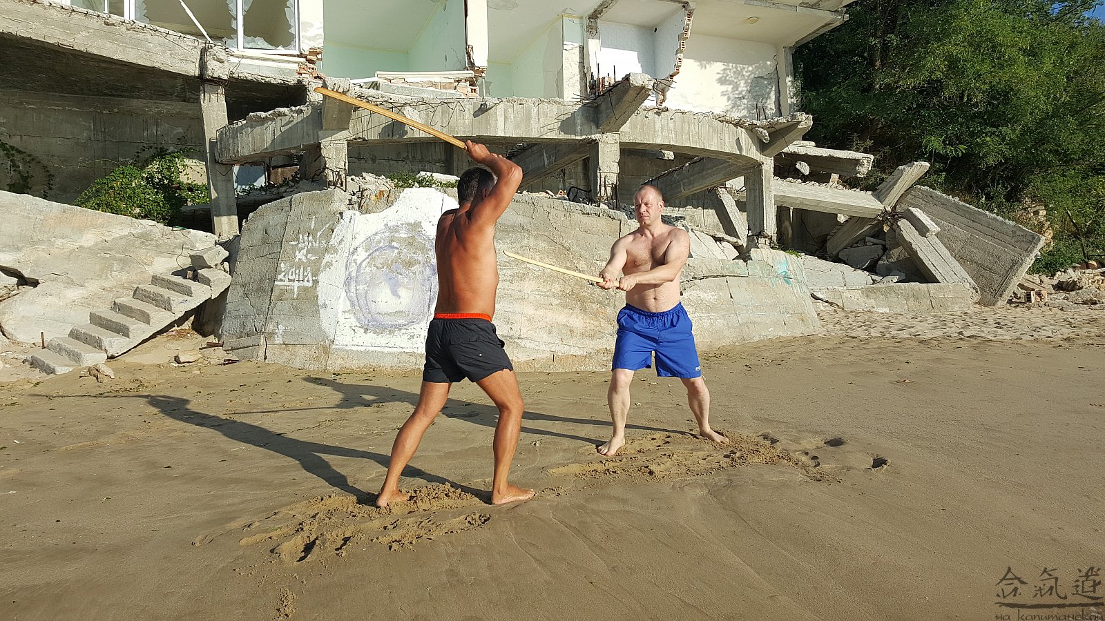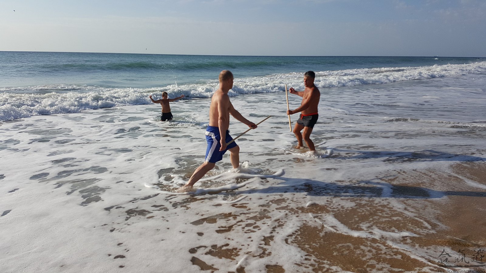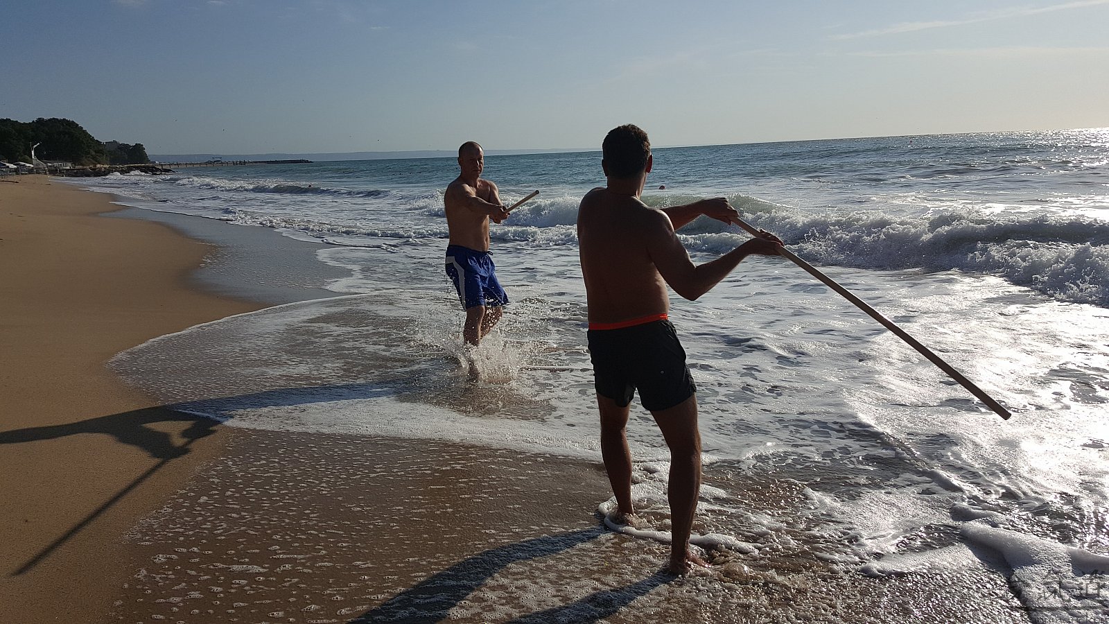 Практика кен-ва-джо на черноморском побережье. Ранним утром, пока солнце только-только начинает нагревать воздух, песчаные пляжи Варны - это, как говорят в Болгарии, истински райски кът для тренировок. А после практики можно охладиться, окунувшись в морские волны.