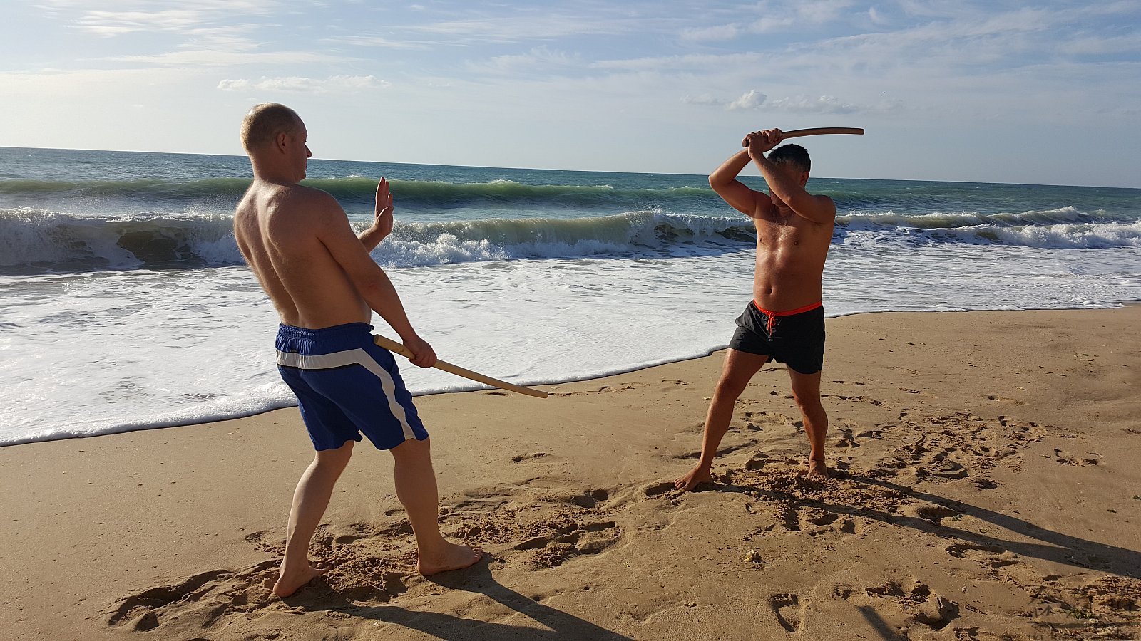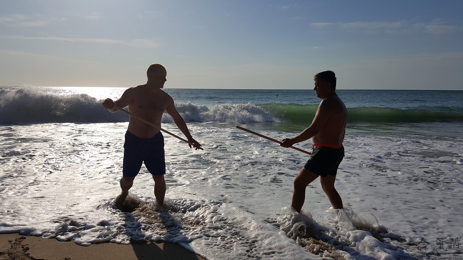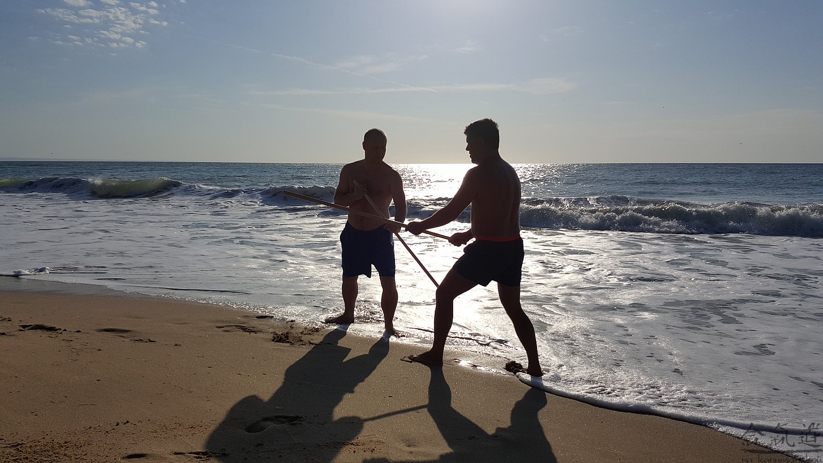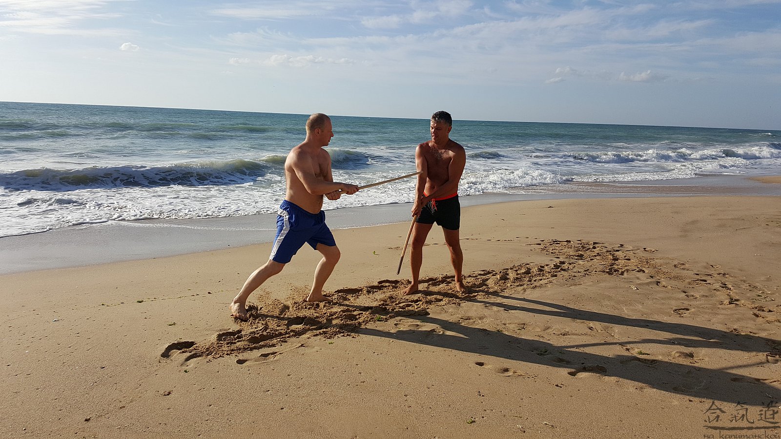 Практика кен-ва-джо на черноморском побережье. Ранним утром, пока солнце только-только начинает нагревать воздух, песчаные пляжи Варны - это, как говорят в Болгарии, истински райски кът для тренировок. А после практики можно охладиться, окунувшись в морские волны.