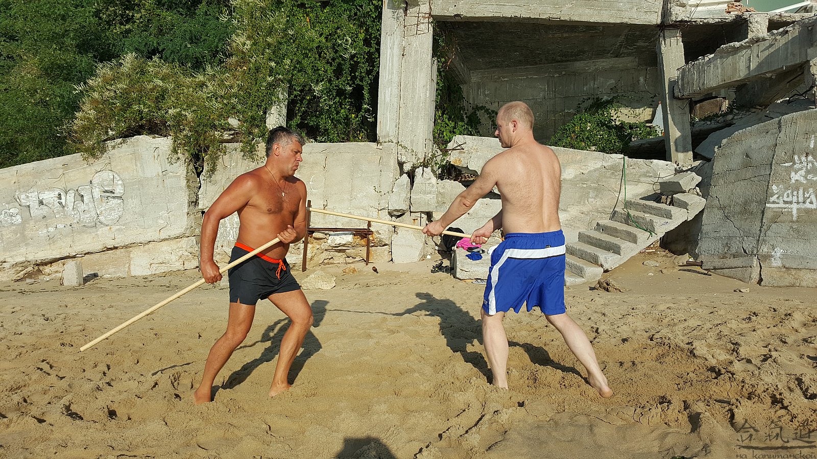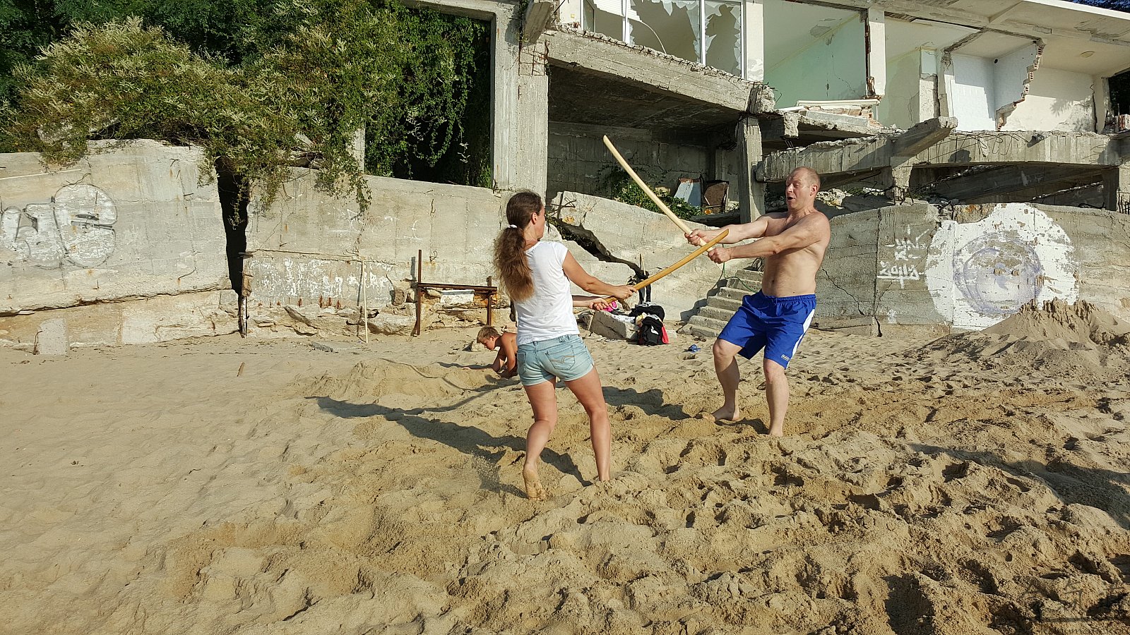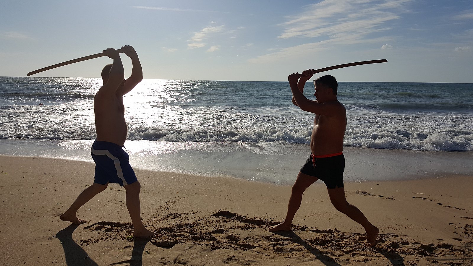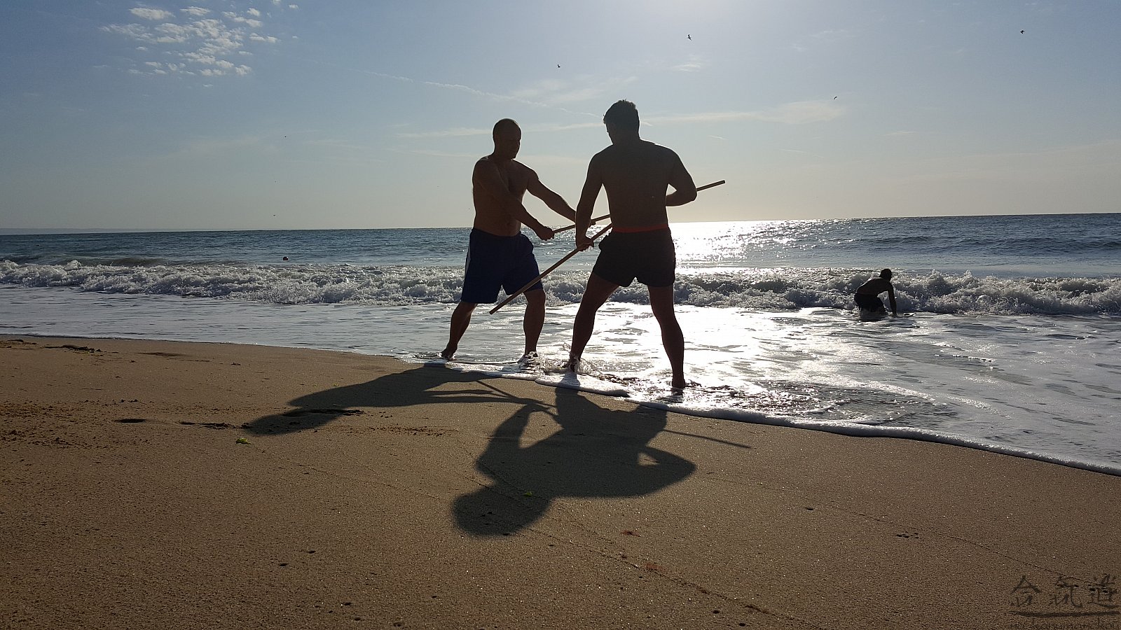 Практика кен-ва-джо на черноморском побережье. Ранним утром, пока солнце только-только начинает нагревать воздух, песчаные пляжи Варны - это, как говорят в Болгарии, истински райски кът для тренировок. А после практики можно охладиться, окунувшись в морские волны.